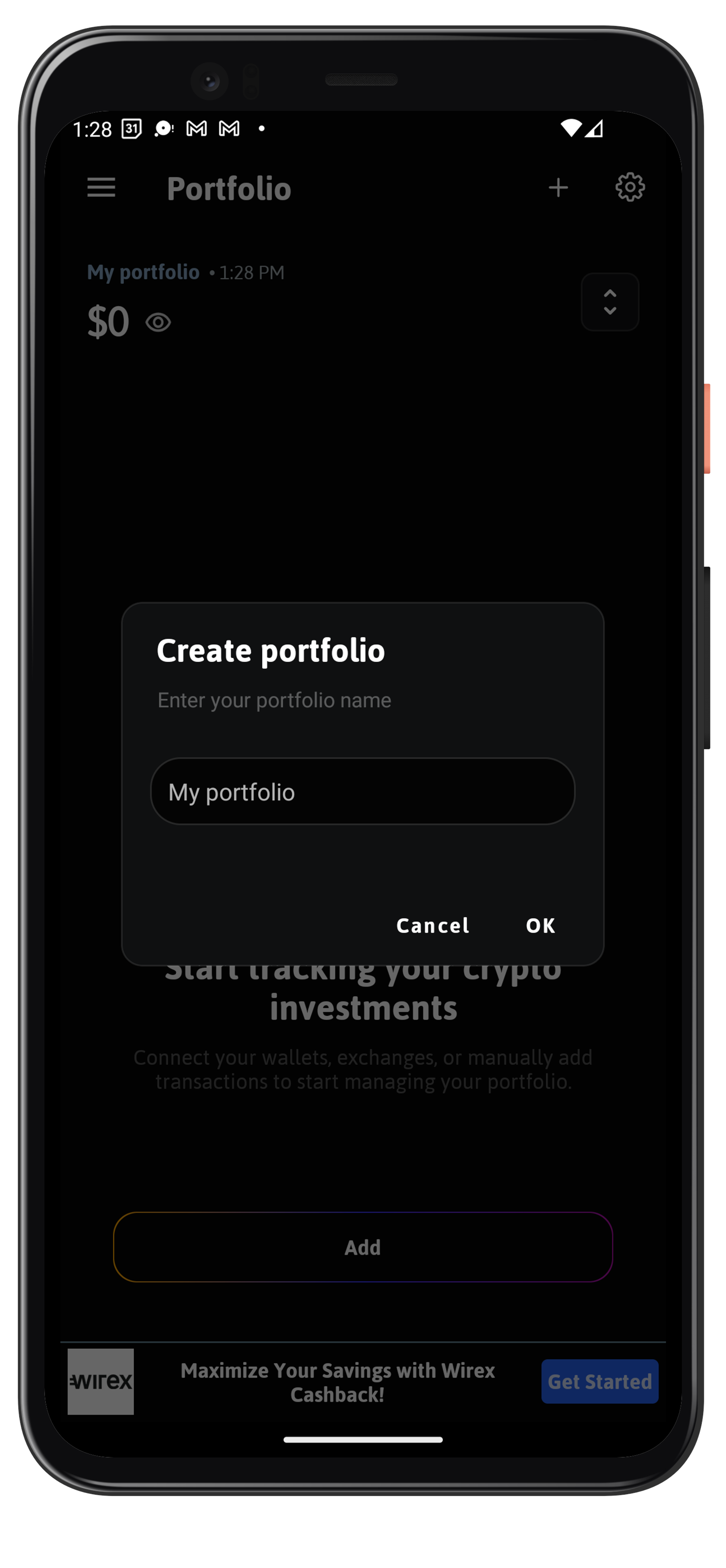 - Create a new portfolio or add to an existing portfolio by tapping “+” in the top right corner